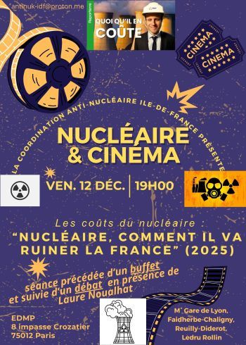 Comme tous les deuxièmes vendredis du mois, la Coordination Anti-Nucléaire d’Ile-de-France organise une projection précédée d’un buffet et suivie d’un débat. Nous vous invitons à nous rejoindre pour partager nos connaissances et réfléchir ensemble sur les moyens de lutter contre le rouleau compresseur du lobby nucléaire.