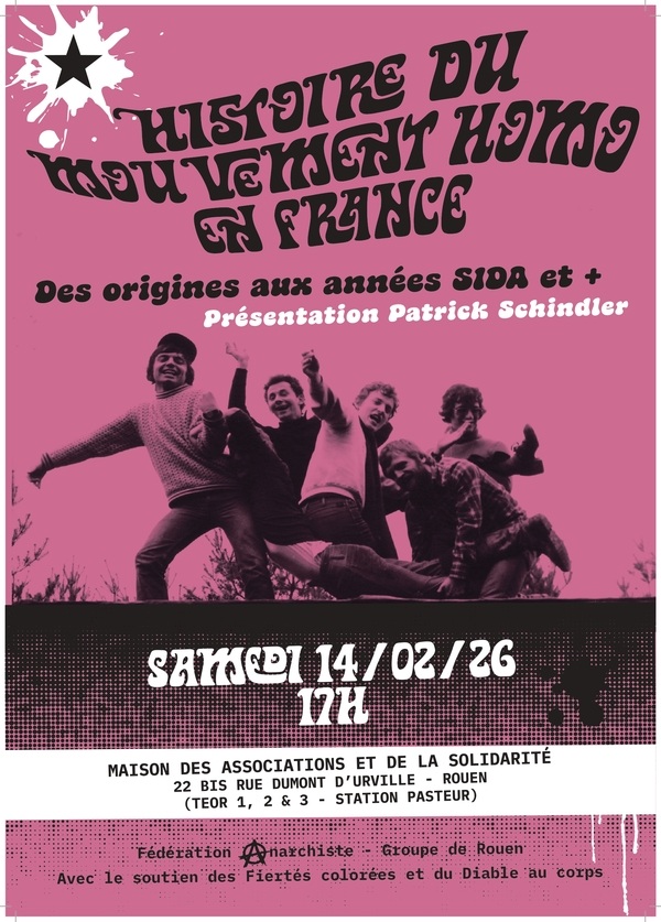 Lors de cette rencontre, organisée par le groupe de Rouen de la FA et soutenu par Les Fiertés colorées et l’association Le diable au corps, Patrick Schindler, ancien militant du FHAR (Front Homosexuel d’Action Révolutionnaire), du GLH (Groupe de Libération homosexuelle), du Journal Gay Pied et d’Act-Up Paris évoquera le l’histoire du mouvement homosexuel, à partir du livre de Mathias Quéré, Quand nos désirs font désordre et en s’appuyant sur sa propre expérience militante.