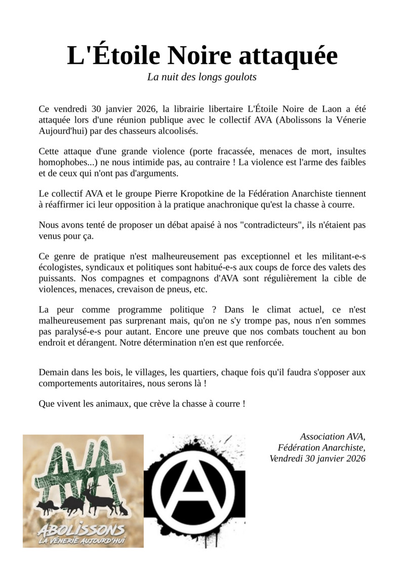 Actus anarchistes > Laon : La librairie L’Etoile noire attaquée par des chasseurs