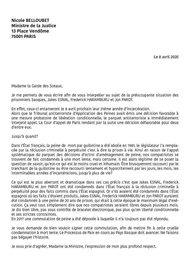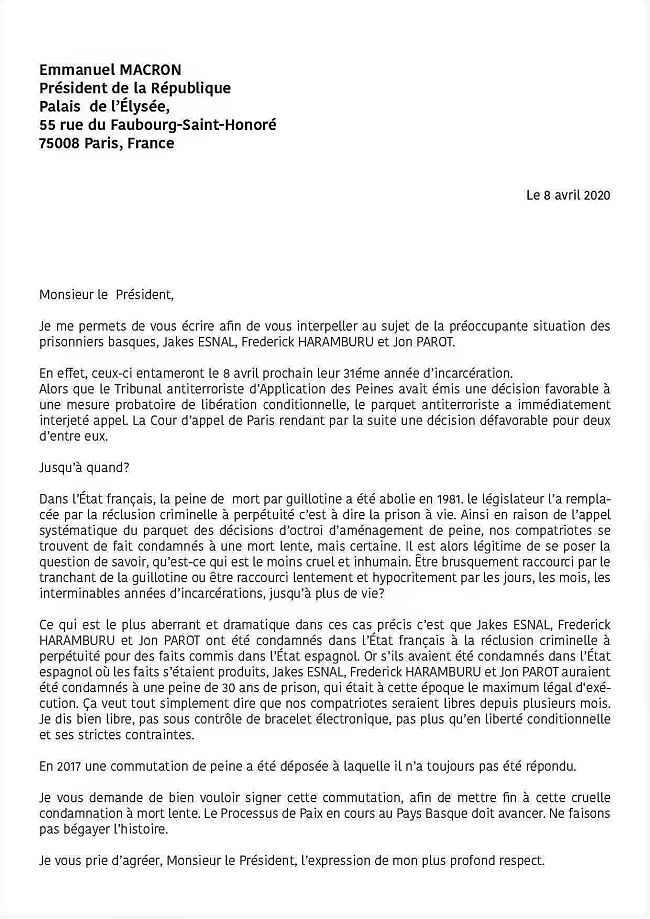ETA a arrêté la lutte armée il y a 10 ans, a remis ses armes il y a 4 ans et s’est auto dissoute il y a 2 ans. Au Pays Basque, les artisans de la paix et l’ensemble de la société civile (toutes tendances politiques confondues), oeuvrent pour un processus de paix. En mai dernier, à Biarritz, E. Macron disait : « Le Pays Basque est pour moi un exemple de résolution de conflit et de sortie des armes (…) Le devoir de l’État est d’accompagner le mouvement. Nous ne devons pas faire bégayer l’histoire. » Résultat, le parquet anti-terroriste (aux ordres du gouvernement) s’oppose à tout aménagement de peine. En clair, Jakès et ses camarades sont condamnés à mourir en prison alors que s’ils avaient été arrêtés et jugés en Espagne, où la peine maximum est de 30 ans, ils seraient en passe d’être libérés. Chercher l’erreur !