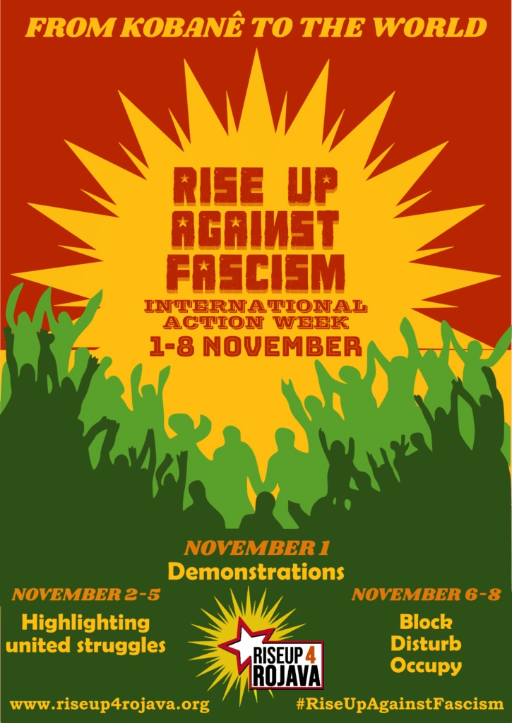 A lire, le communiqué et l’affiche de RiseUp4Rojava : "De Kobanê au monde entier: Soulèvement contre le Fascisme".