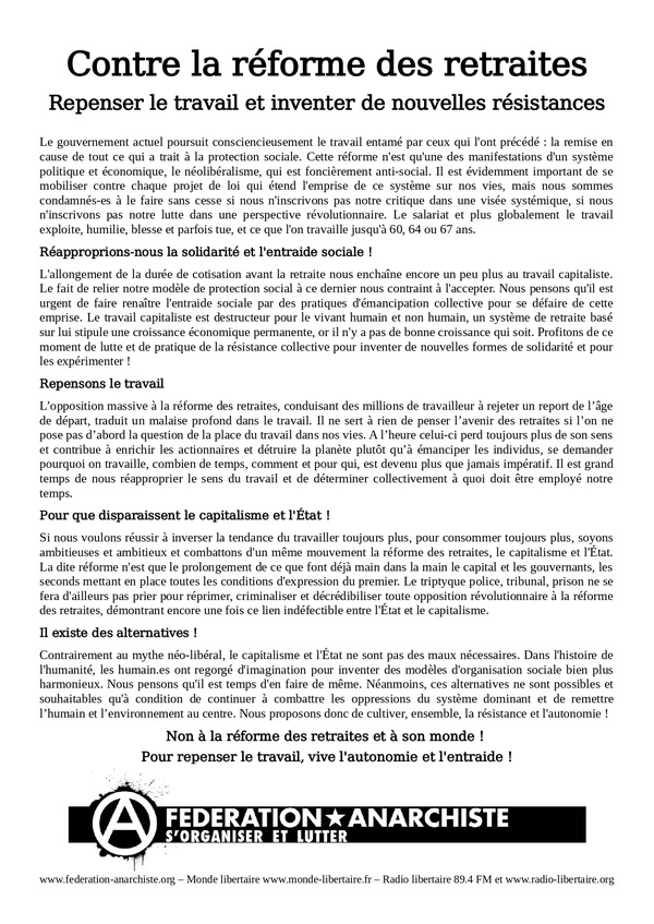Actus anarchistes > Tract contre la réforme des Retraites que des groupes de la région parisienne ont diffusé