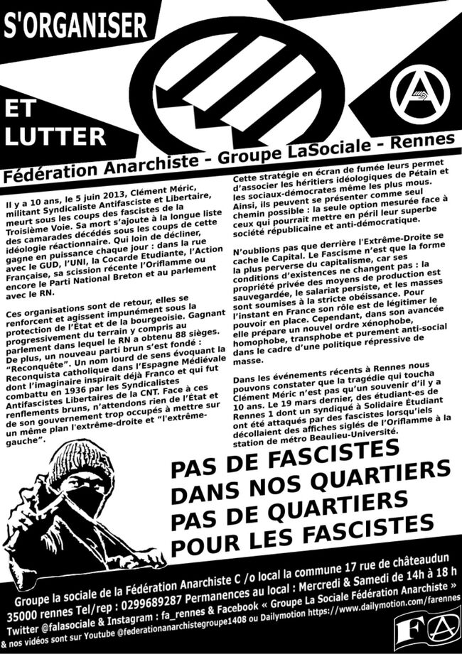 Tract distribué à Rennes pour le 10e anniversaire de la mort de Clément Méric