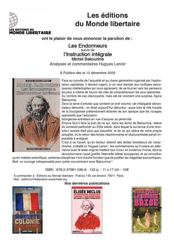 D’une part, en tant qu’anarchistes, nous nous déclarons athées et peu nous chaut que les différentes Églises soient séparées de l’État, puisque ce sont pour nous deux réalités à combattre.